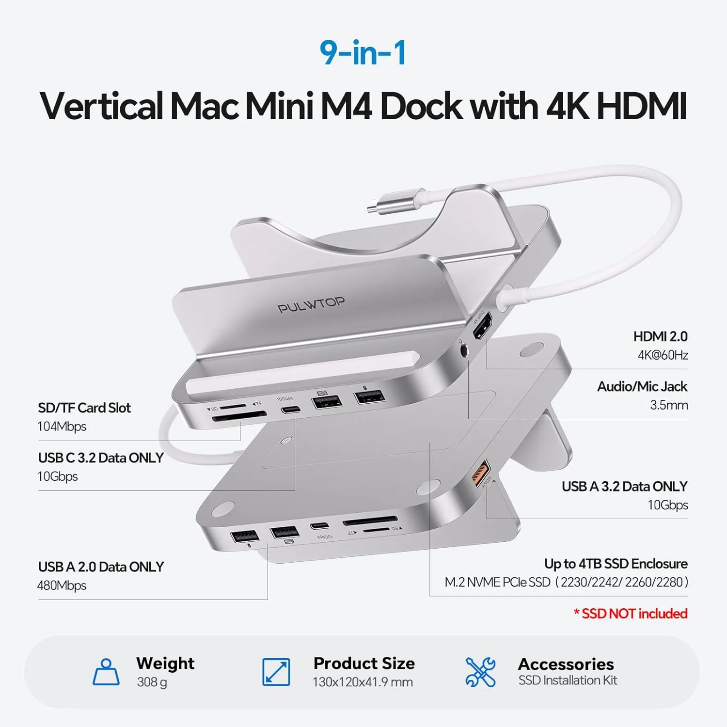 The PULWTOP BS212D is a premium 9-in-1 vertical docking station designed exclusively for Mac mini M4 and M4 Pro users. Engineered with a sleek aluminum alloy body, it combines high-speed connectivity, efficient cooling, and expanded storage in one compact solution. Whether you’re a creative professional, tech enthusiast, or productivity-driven user, this multifunctional hub transforms your Mac mini into a powerhouse workstation. With support for up to 4TB M.2 NVMe/SATA SSD, 4K HDMI output, and multiple USB ports, it eliminates clutter while enhancing performance.